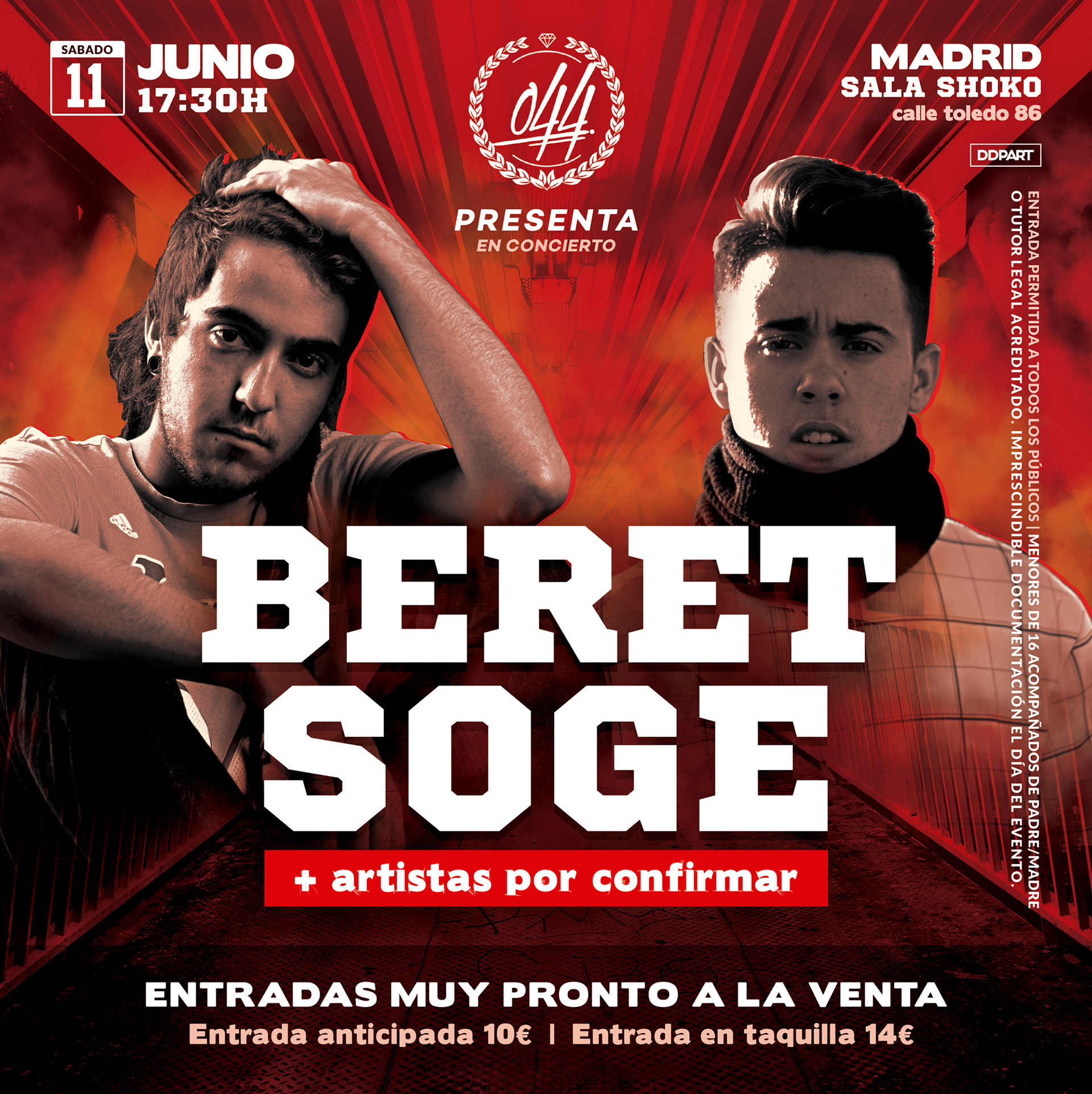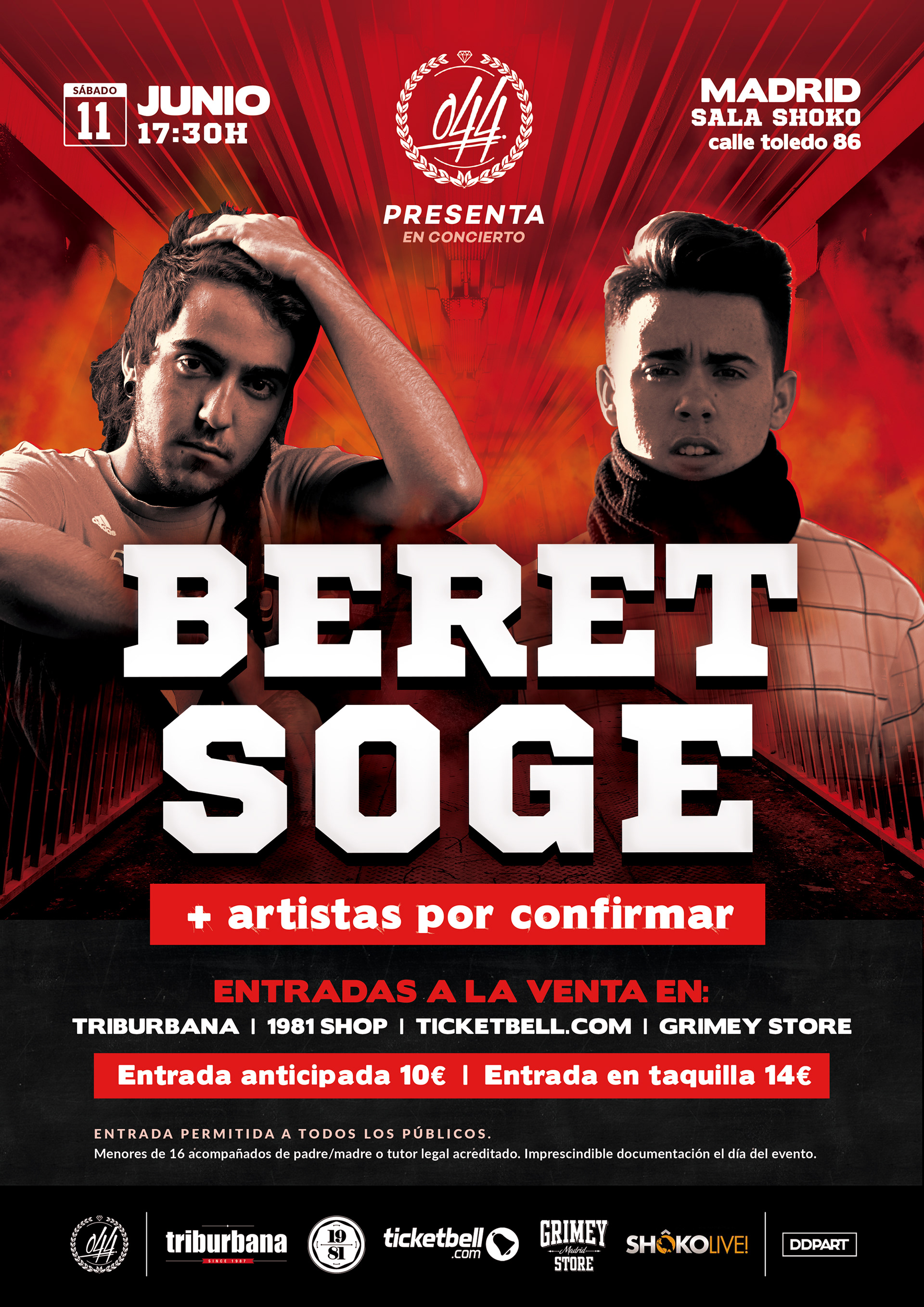 Carteleria e imagen diseñada para el concierto que organiza la marca 044 Wear en colaboración con los artistas Beret y Soge en la sala Shoko de Madrid.